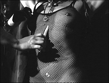 | Role-playing and role reversal abounds. Don’t miss the scene where the sexy bottom turned top wields a long sharp knife to cut off the fishnet leotard her top’s wearing. Ooh-la-la. |